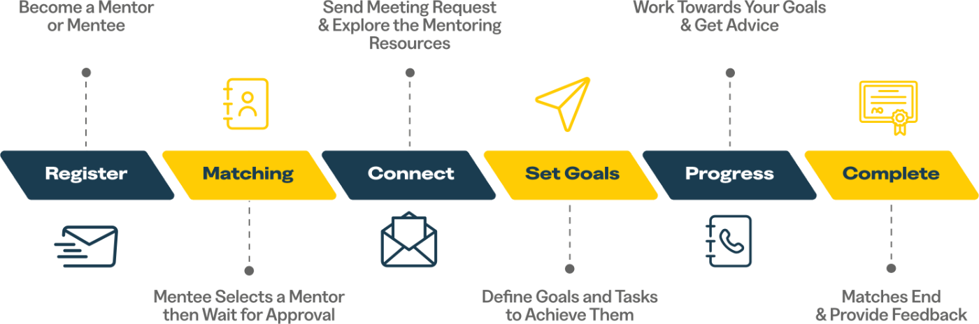1. Login with your member account 2. Select to be a mentor or mentee 3. If a mentee - select a mentor 4. Once matched - connect with your match 5. Meet, take Journal notes, set Goals & Tasks 6. Read the mentorship resources